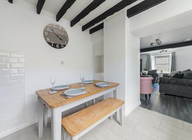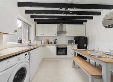 The downstairs area contains a living room and kitchen, a lovely and cosy setting with an exposed fireplace and log burner. The modern kitchen is well-appointed and provides all you need for a holiday. The master bedroom in the property mixes modern comfort with traditional features, such as the wooden beams running across the ceiling! The second bedroom contains two single beds, making the property perfect for a small family.