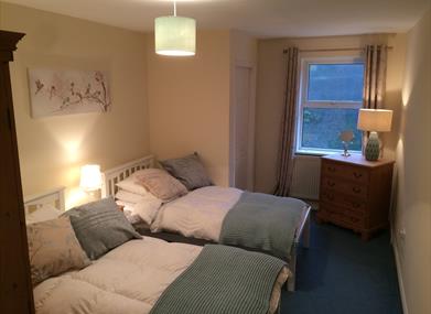Second Bedroom – twin beds, bed side lamps, wardrobe, chest of draws, window views to rear