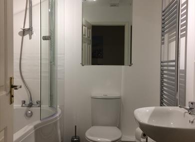 Bathroom – newly refurbished, P shaped bath with shower & curved screen, toilet, basin, chrome ladder radiator