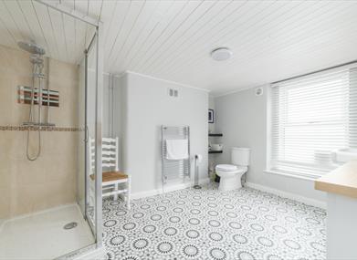Bathroom: Walk-in shower, wash hand basin and WC.
