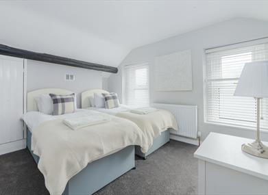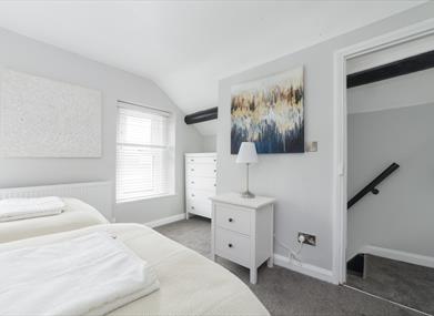 Bedroom 2: Twin beds, bedside table and chest of drawers.