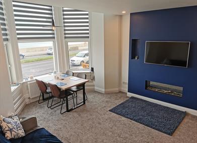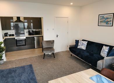 Antrim Apartment is self catering ground floor seaview apartment with fully equipped kitchen including coffee machine and microwave. Layout is open plan kitchen, dining and living area with sofa bed. 1 double bedroom. Bathroom with over shower bath. Fibre Wi-Fi.