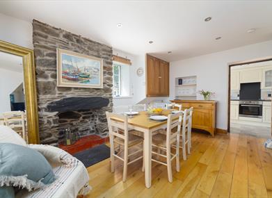 Dining room: Dining table and chairs for six, dishwasher and tumble dryer (under stairs), feature fireplace