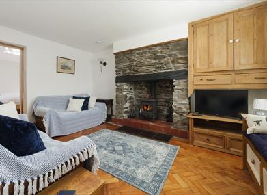 The cosy sitting room has a magnificent Manx "Chiollagh" stone fireplace with wood burning stove and comfortable seating.