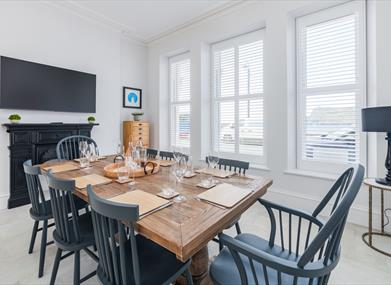 Kitchen & Dining Area: Well-equipped kitchen, featuring oven, hob, microwave, toaster, Nespresso VertuoPlus coffee machine and breakfast bar. Dining area contains table and seating for 8 people, with a large Smart TV. Access to outdoor area via large French doors.