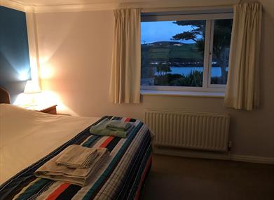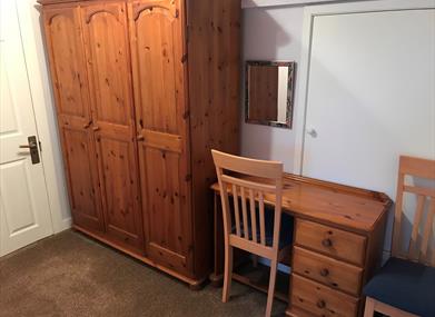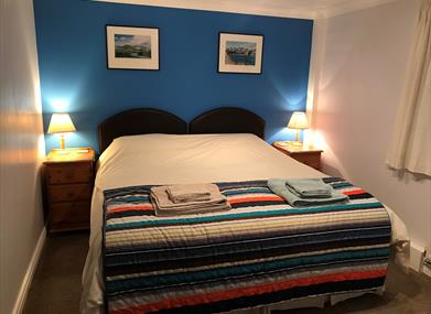 The bedroom has a super king double bed with bedside tables and plenty of drawer/hanging space for clothes. There is a hairdryer. Bedding is provided.