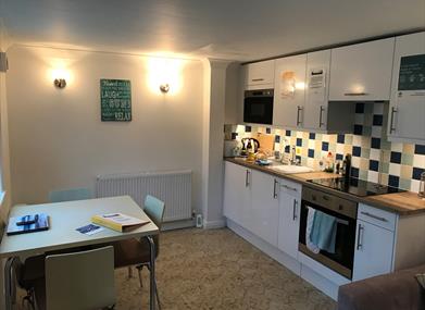 The kitchen is well-equipped with fridge (with freezer compartment), electric oven, 4 ring induction hob, microwave, kettle, toaster, cafetière, utensils, crockery and cutlery. The dining table can seat 4 people and outdoor furniture is available should you wish to eat on the patio. Please note that the garden and patio are shared with the owners.