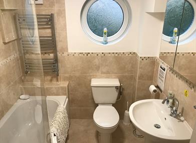 The bathroom has a bath with shower over it, basin with mirrored cabinet (with shaver socket and light), toilet and heated towel radiator. Towels are provided for the bathroom. The towels must NOT be taken out of the unit and are not for beach/swimming use.