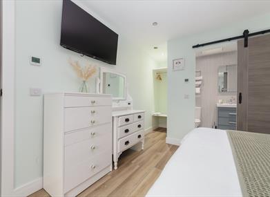 Bedroom 1: King size bed, Smart TV, bedside cabinets, dressing table, chest of drawers and hanging space
