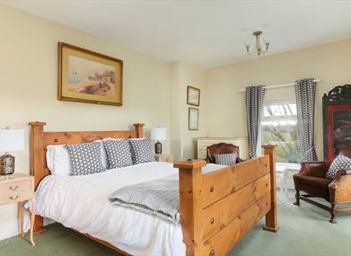 Bedroom 1: Kingsize bed, bedside cabinets, chest of drawers, large wardrobe, drawers, chair