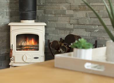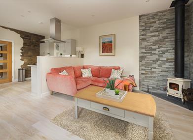 Lounge/Dining area: Log burner, corner sofa, coffee table, smart TV, Dining table with four chairs