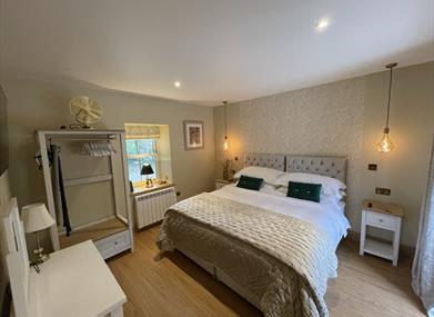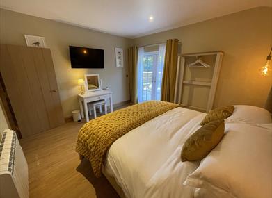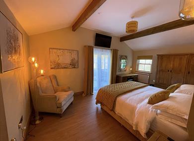 This cottage has one luxury super-king bedroom, styled with rustic wooden furniture which perfectly complements the aged ceiling beams. French doors lead onto your private patio area where you'll find your hot tub, picnic table and rattan furniture.