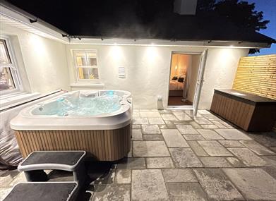 This cottage has two super-king bedrooms, one of which can be set up as a twin by prior request. Dressed with sumptuous, boutique-hotel quality bed linens and luxurious velvet throws, our bedrooms are designed with relaxation in mind. Both bedrooms have French doors which lead onto a private patio area, equipped with your own hot tub and outdoor seating. A perfect viewing point over the garden and open countryside, where you can watch the wildlife from, or sink into the spa of an evening and indulge in some serious stargazing!