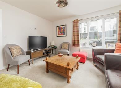 Living room: Sofa, flat screen smart TV, seating for 8 people.