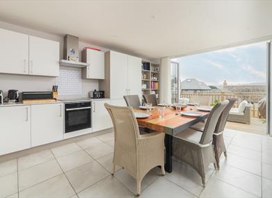 This modern town house provides a light and airy space for a large group. The open plan kitchen and dining area opens up onto a sunny south facing terrace providing lots of space for everyone to enjoy. Upstairs, each of the bedrooms are modern and well equipped with each room having its on TV and a bathroom on each floor.