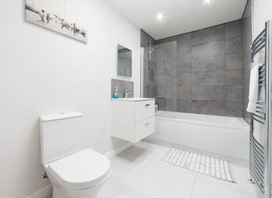 Bathroom: Bath with shower over, W/C, wash hand basin