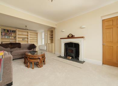 Living room 2: Log burner, L-shaped sofa, two armchairs and many books which are there to be read