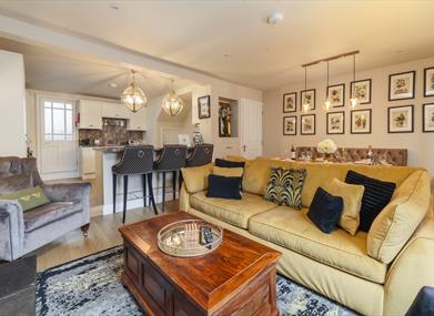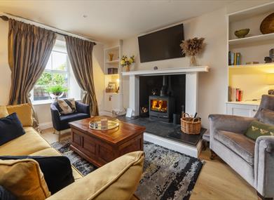 Dining/Living Room: Dining table with ample seating, Smart TV, log burner with log store in the coffee table, sofa, two armchairs.
