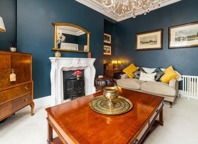 Drawing Room: Two sofas, Smart TV (hidden in cabinet), electric fire, USB charging ports