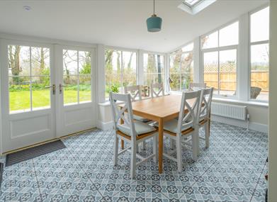 Reception Room leading to Orangery laid to tiled flooring. Dining table for six persons and comfortable seating for 3 persons. Patio Doors leading to gardens. Dining Room laid to hardwood flooring and door through to kitchen.