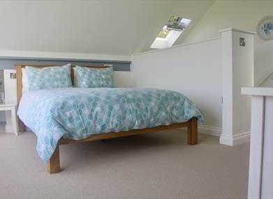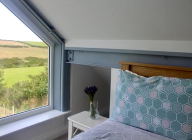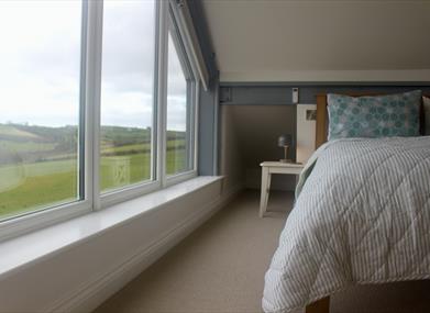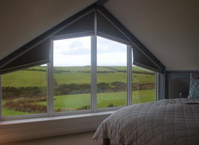 The upstairs bedroom offers a spacious, comfortable room with spectacular views. A solid oak, King-size bed sleeps two guests. Fitted with electric blackout blinds to help you get a restful night sleep.