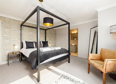 Bedroom 1: King size four-poster bed, bedside tables, chest of drawers, occasional chair, TV and built-in wardrobe.