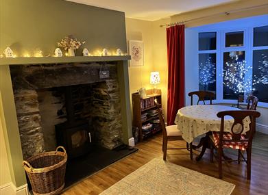 Original fireplace in sitting room with comfortable furniture and TV/CD Player. Wood burning stove in dining room with well-fitted kitchen adjacent. Neff hob and oven, dishwasher, microwave and fridge freezer are fitted into white kitchen. Hall, stairs and landing with study space leads to 2 bedrooms, one with double bed and one with twin or king-size bed. Lovely bathroom with separate walk-in shower and bath.
