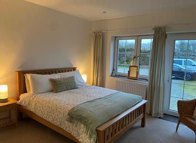 Bedroom: King size bed, wardrobe, bedside cabinets and access to parking area and rear of property.
