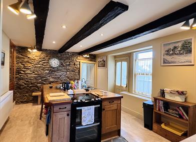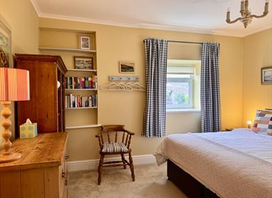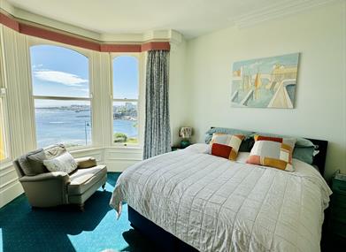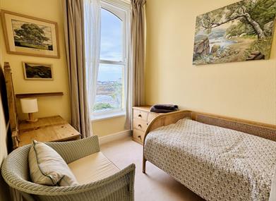 There is a fully-equipped kitchen with ceramic hob, convection oven and microwave; a dish-washer, under counter fridge with ice box. In the utility a Belfast sink plus washing machine and tumble-dryer, ironing facilities and a larder fridge - and beyond a small WC. The separate dining room provides seating for at least eight, with heavy French oak table and chairs as well as bench seating. The sitting room is spacious with a large sofa and sofa-bed if required. There is a circular oak table with chairs in the wide bay window, a place to have a cuppa and enjoy the spectacular views across the beautiful harbour and out to sea.