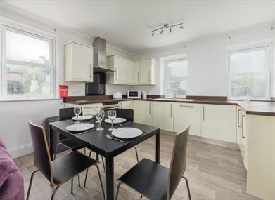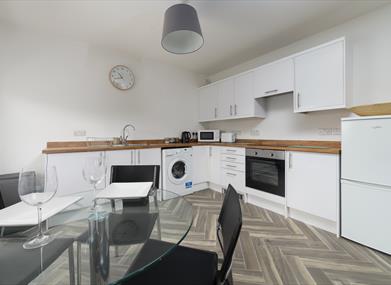 Kitchen/dining area: Containing Oven, hob, microwave, toaster, kettle, dishwasher, fridge-freezer, dining room table and 4 chairs.