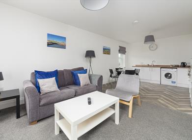 Living room: Sofa, flat screen TV, , seating for 4 people.