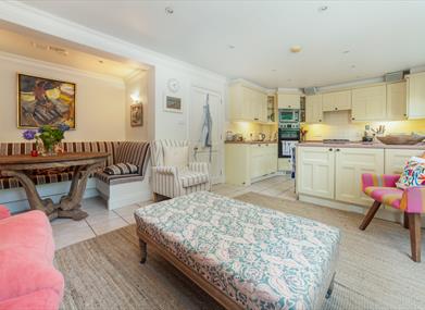 Seating Area: Dining table with booth seating, comfortable sofa, two armchairs and footstool. Access via French doors to outside space.