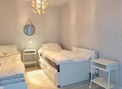 2 bedrooms, 2 bathrooms, one bedroom ensuite with kingsize bed, one bedroom with double and single bed, and sofa bed for 2 in lounge