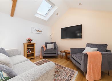 Living area: Comfortable sofa (which can be converted to a sofa bed, bookable at an additional cost), smart TV, two comfortable chairs.