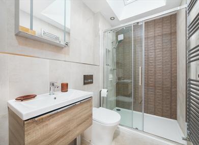 Bathroom: Walk-in shower, WC, heated towel rails and wash hand basin.