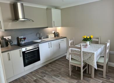 Self-catering secluded rental apartment located on the ground floor with easy access. Property includes well equipped kitchen diner, including hob, microwave, air fryer, fridge, toaster, kettle, crockery, cutlery, wine glasses, pots and pans and other items.