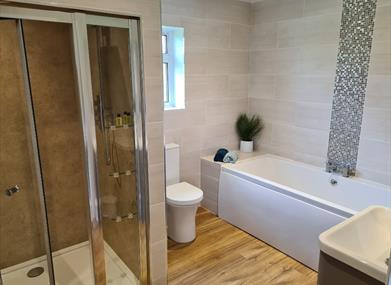 En-suite bathroom equipped with bath, toilet, wash basin and separate walk in shower cubical. Fitted heated mirror with shaving point, bath towels, body shampoo and loo roll supplied.