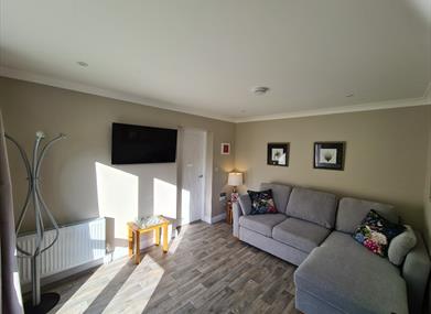 Spacious lounge area, with smart tv and corner sofa, fitted USB sockets.