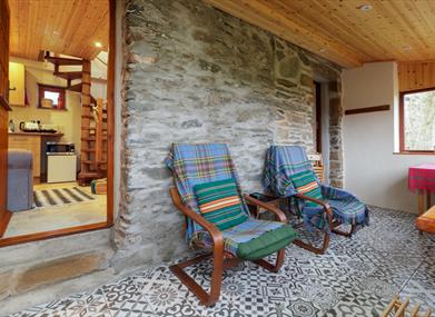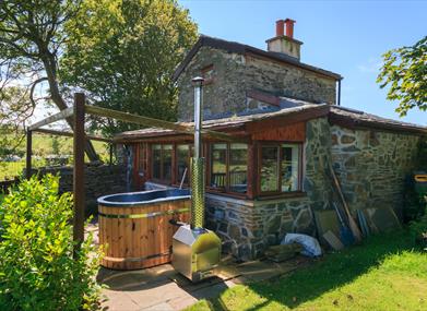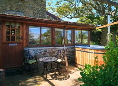 The conservatory is bright and airy, looking over the garden and patio where the wood fired hot tub is.