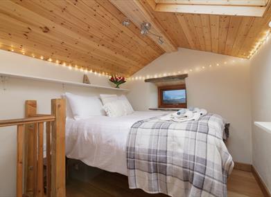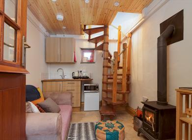 Downstairs is a sitting room with wood burning stove and kitchen area; this contributes to the cosy feeling the cottage gives guests. The addition of fairy lights and record player create a relaxingly warm atmosphere.