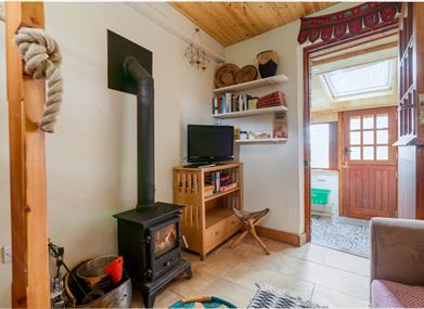 Lounge: Sofa, TV, log burning stove.