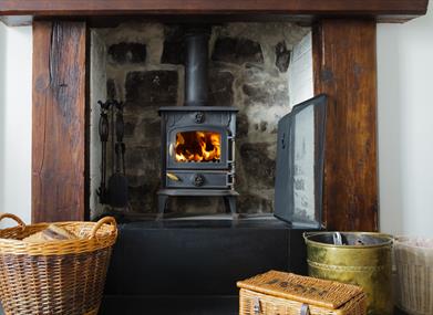 Living & Dining Area: Two sofas, Smart TV, log burner and dining table seating 4 people.