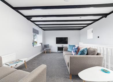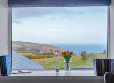 Living area: Elevated sea and countryside views. Two sofas, armchair, Smart TV and nest of coffee tables.