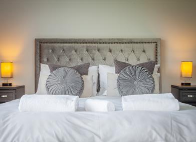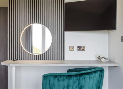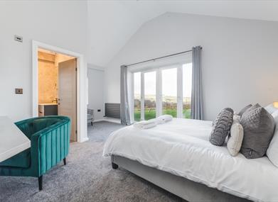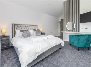 Bedroom 1: King size bed, bedside tables, wardrobe, dressing table with vanity mirror, Smart TV. Sea views and access to garden area through French doors.