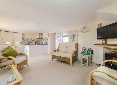 Living area: One two seater sofa, two armchairs, coffee table, Smart TV and electric fire.