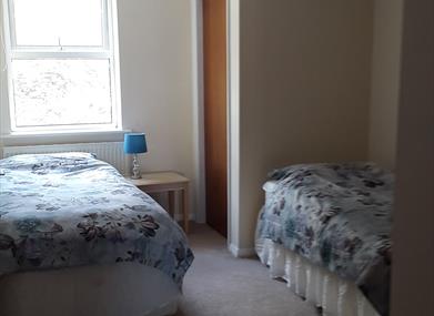 Reayrt Y Vaie means bay view in Manx, and this modern, bright and spacious apartment provides an uninterupted panoramic view of Douglas Bay, with the beach and promenade directly across the road. This fourth floor apartment consists of two bedrooms (one double and one twin), a large living area with dining table in the bay window, fully equiped kitchen and recently refurbished bathroom. The double bedroom has a kingsize bed with memory foam mattress, a fitted double wardobe and mirrored furniture. There is plenty of room in master room for a travel cot. (supplied if needed). The twin room also has a double fitted wardrobe. The bathroom is fully tiled with bath and shower. The kitchen has a washer/drier, dishwasher, microwave, full oven and fridge/freezer. There is additional parking at rear of property.