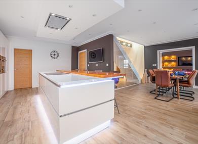 Kitchen/Dining area: Oven, combi microwave, boiling water tap, large integrated fridge / freezer, dishwasher, Smart TV, dining table & eight chairs and kitchen island featuring electric hob, breakfast bar and pop-up socket.