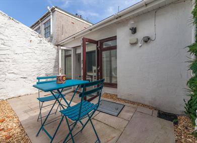 Outdoor space: Small secluded area with a table and chairs