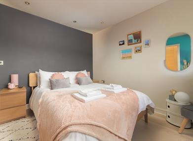 Bedroom 1: Double bed, bedside cabinets, chest of drawers, wardrobe