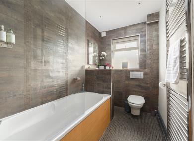 Bathroom: Bath with shower over, w.c., basin and vanity unit.